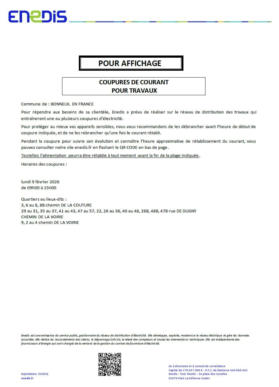 Enedis vous informe d’une coupure de courant pour travaux concernant la commune de BONNEUIL EN FRANCE.